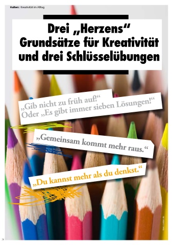 Halten: Kreativität im Alltag Drei „Herzens“ Grundsätze für Kreativität und drei Schlüsselübungen „Gib nicht zu früh auf!“ Oder „Es gibt immer sieben Lösungen!“ „Gemeinsam kommt mehr raus.“ „Du kannst mehr als du denkst.“ Foto: ccvision.de 36